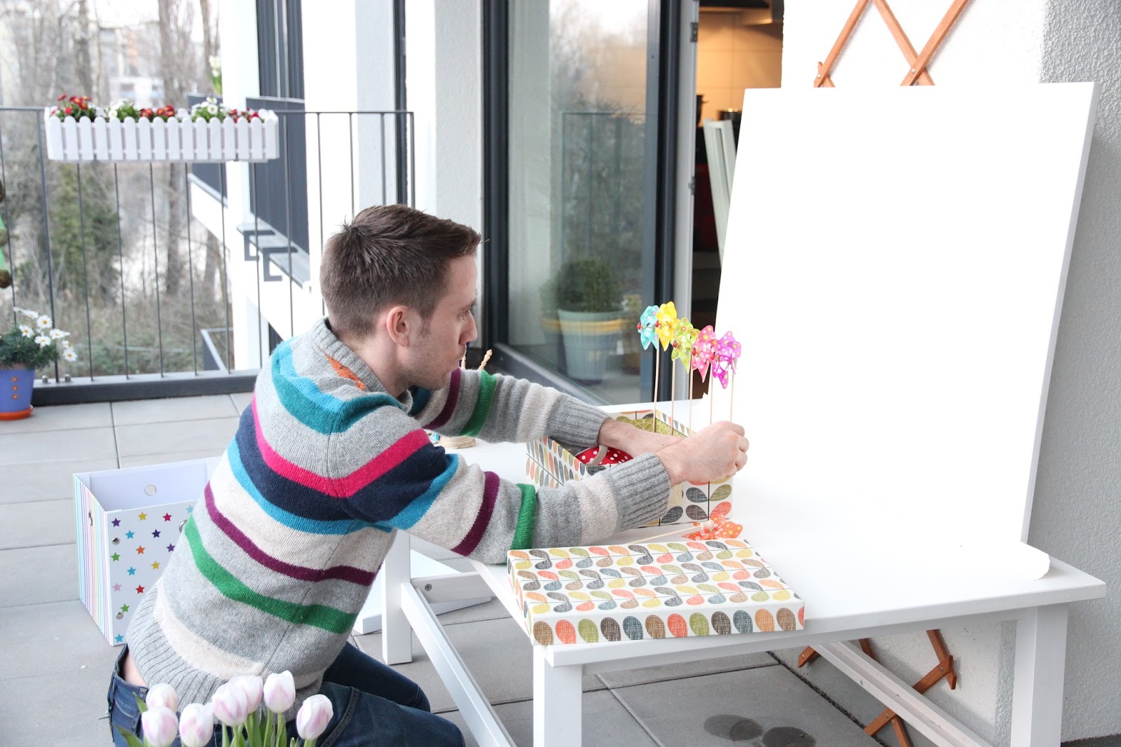 The bedside table was moved from the bedroom into the living room. Then I added a few boxes and props that normally live in various other areas of the apartment.